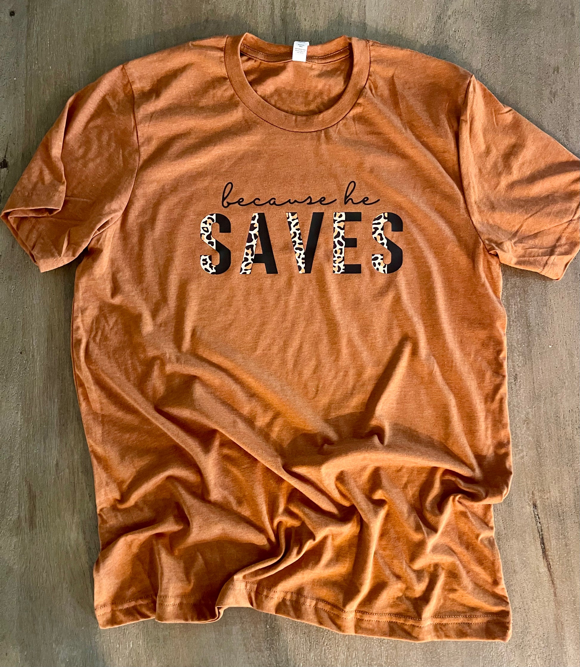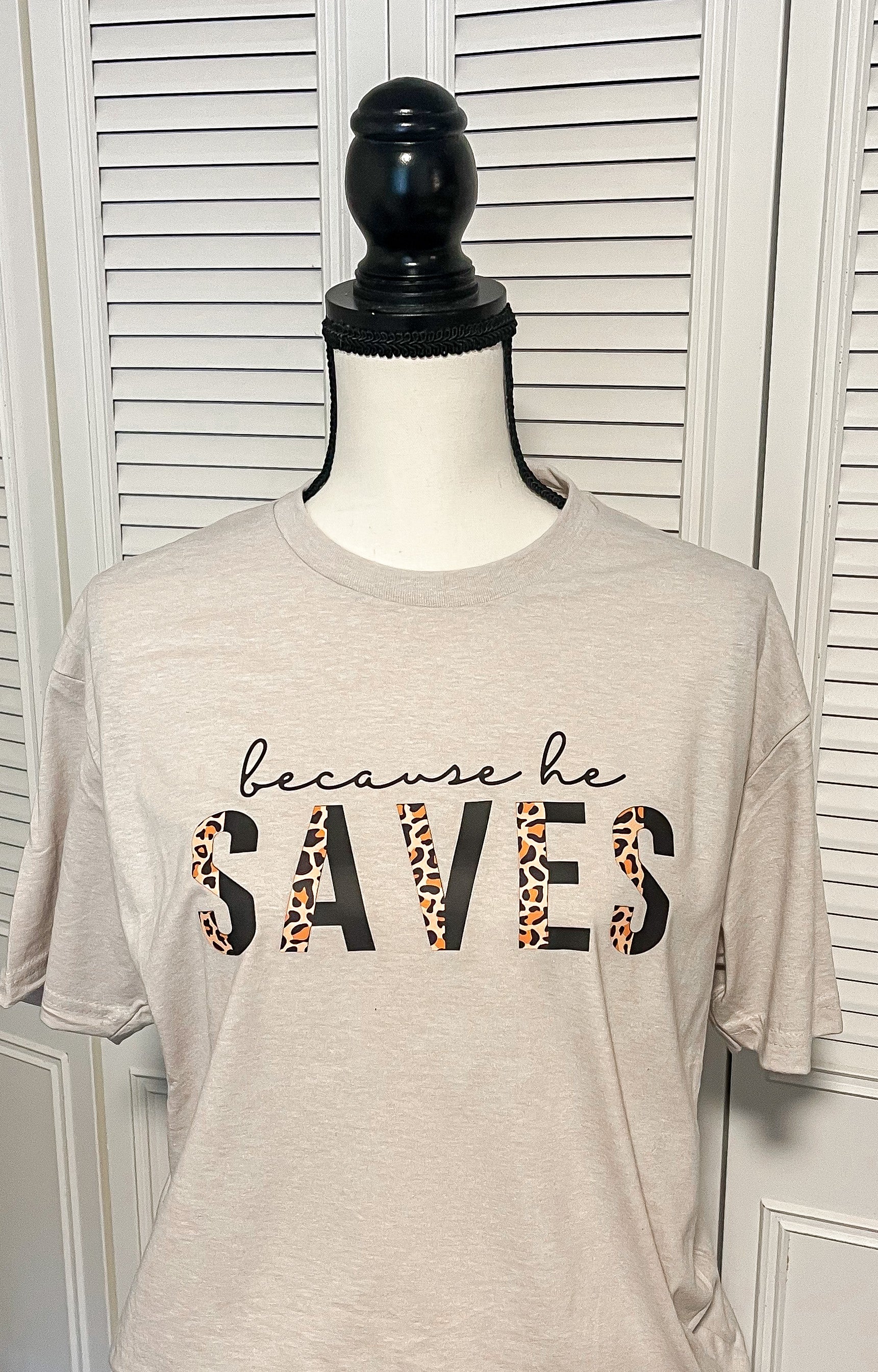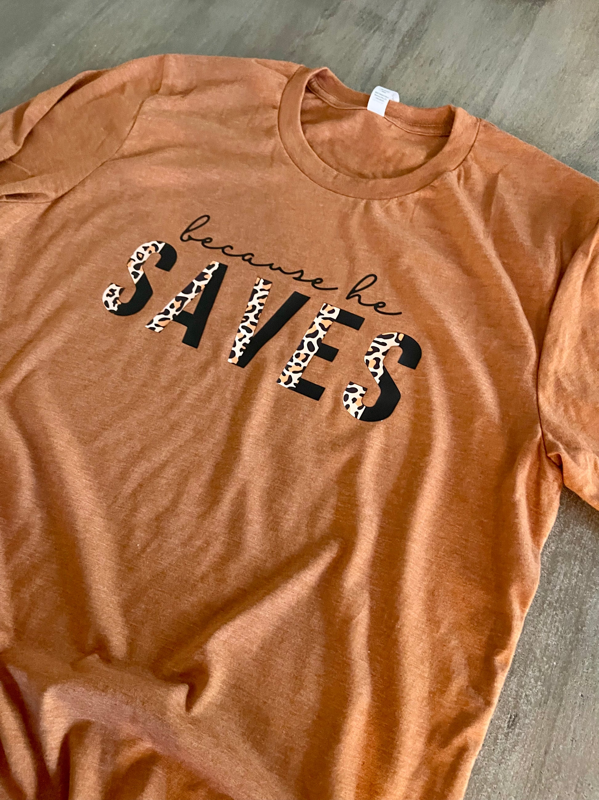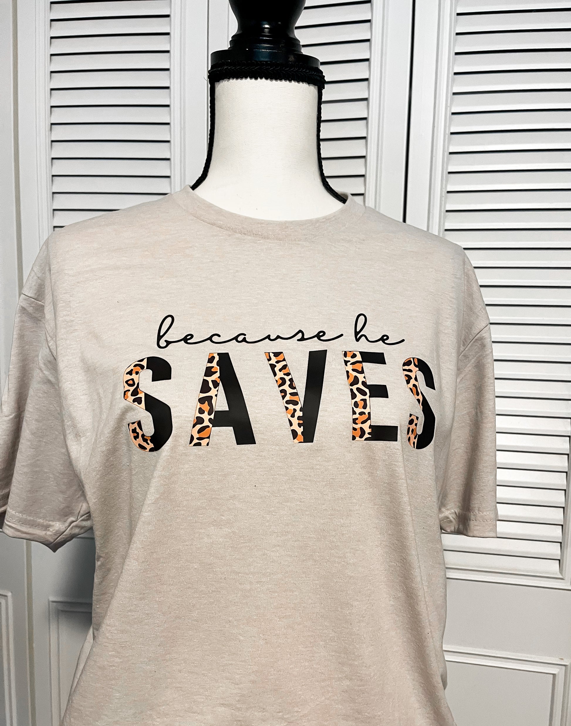 Show your faith and your style with this soft "Because He Saves" t-shirt. The perfect combination of comfort and confidence you need for any occasion, and with a message of faith that no one can ignore! The perfect gift for any believer!