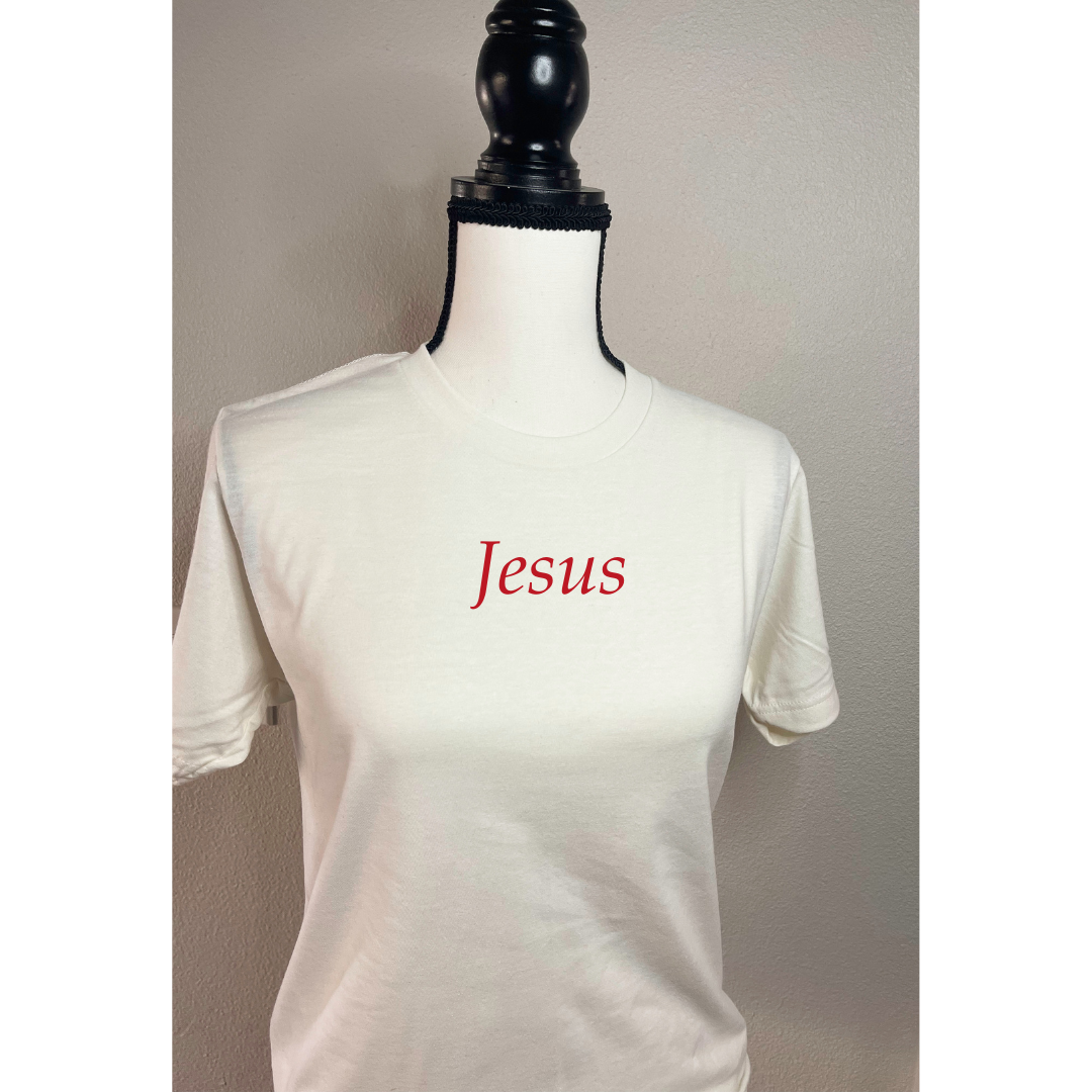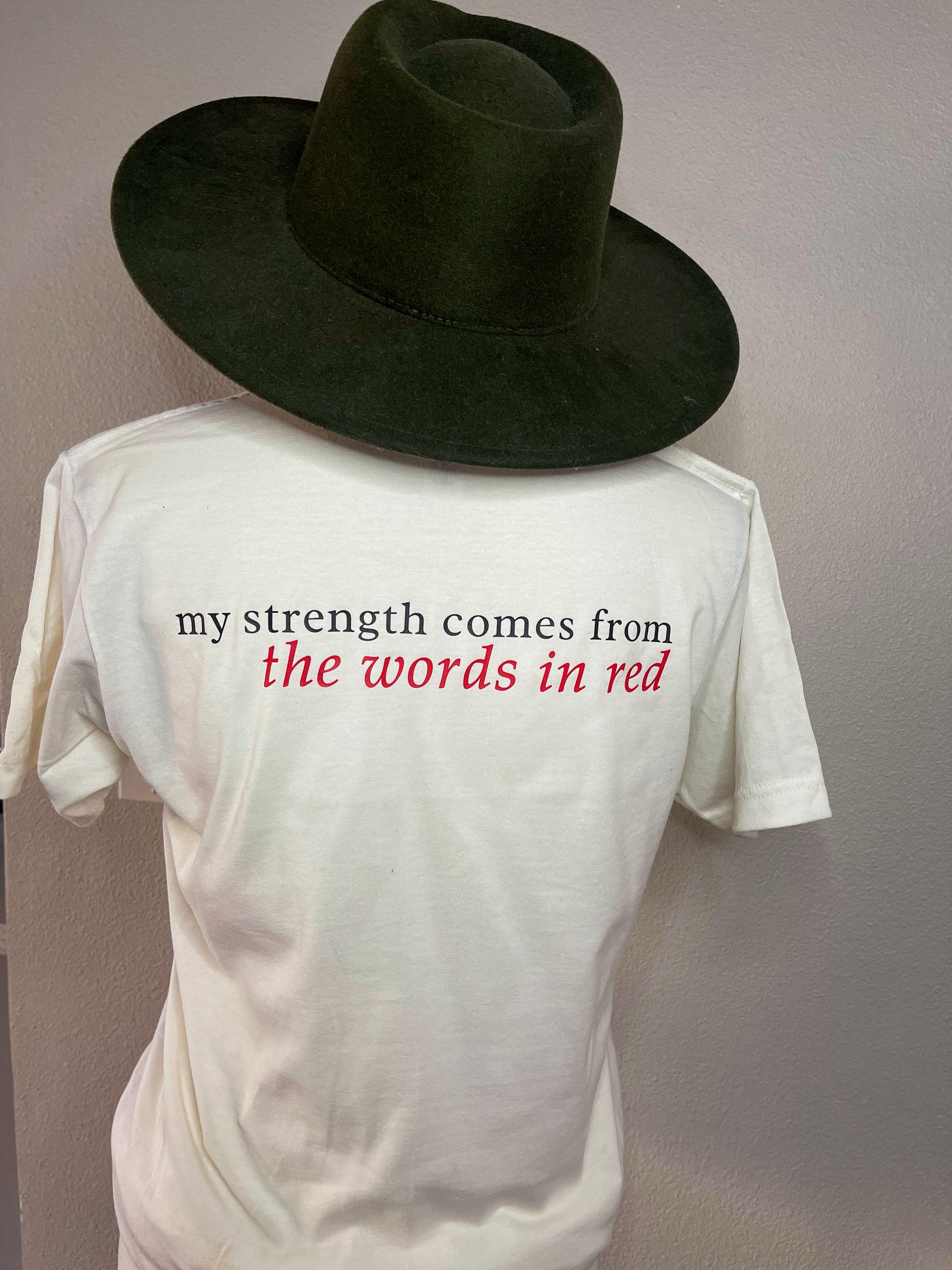 Our Red Letters T-shirt features bold red lettering on a classic cream colored fabric, a perfect representation of the strength and power that comes from Jesus' words in the pages of the Bible. Grab this tee and make a bold declaration of where your strength comes from!