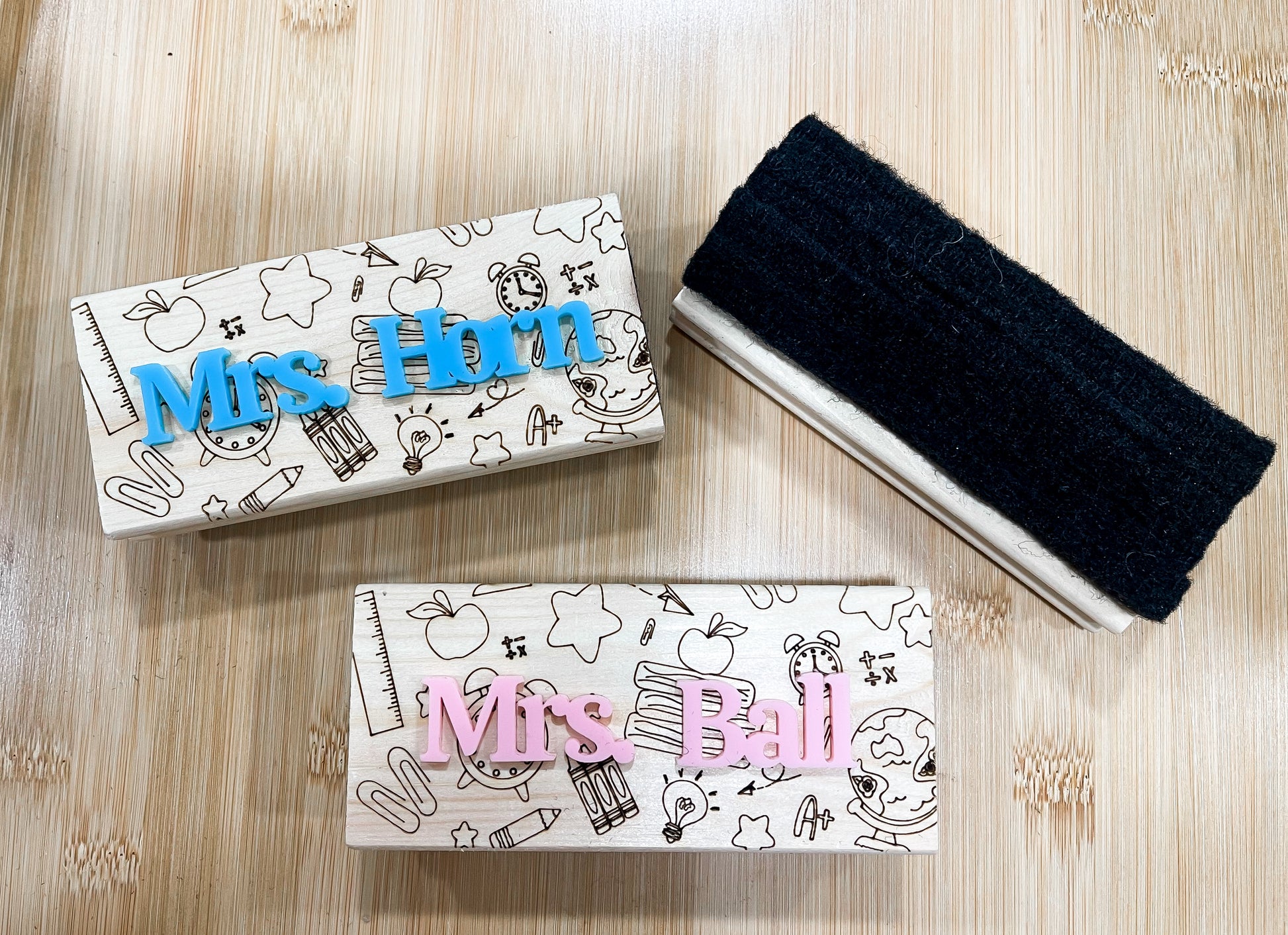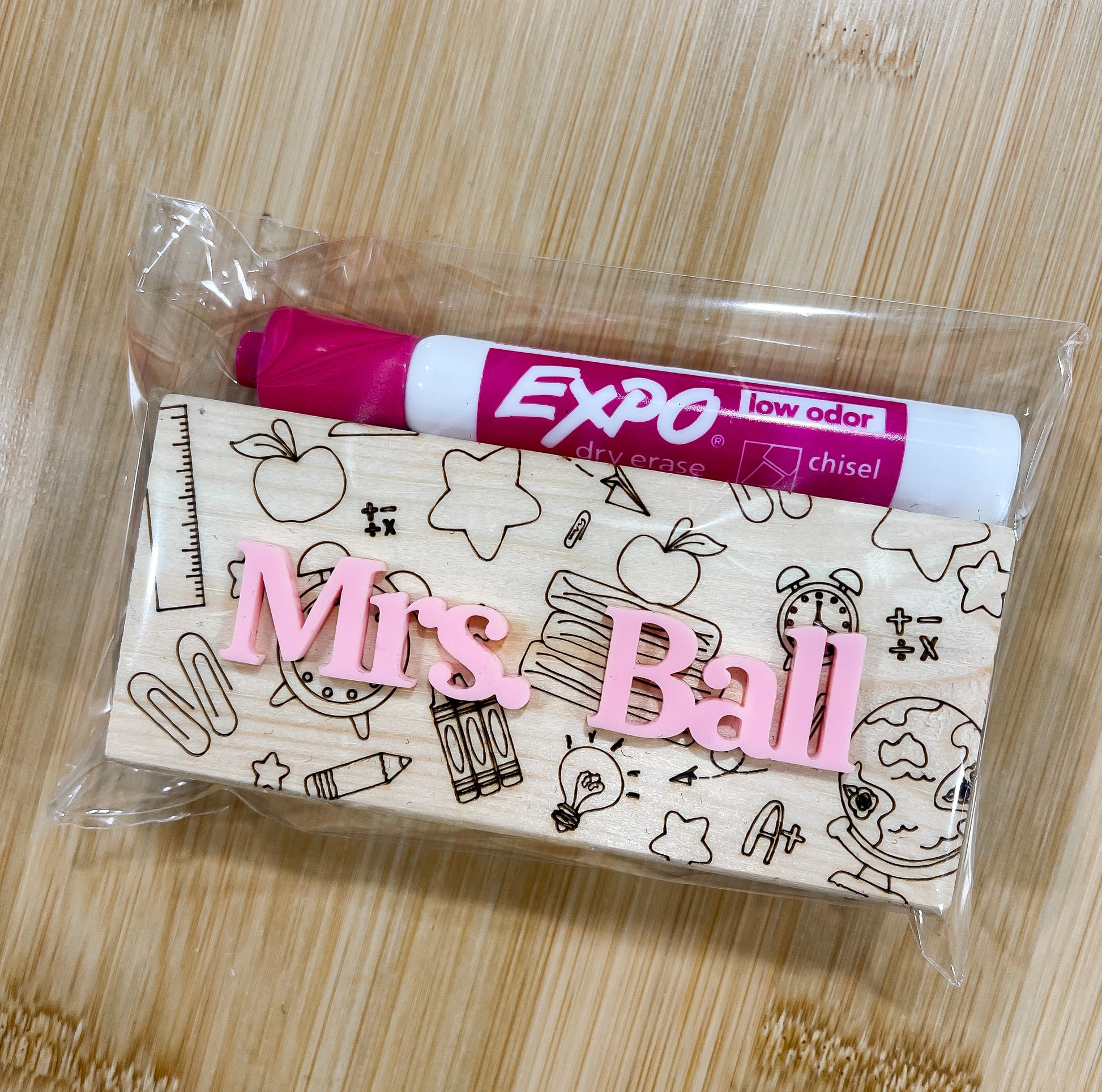 Introducing our Personalized Whiteboard Eraser for Teachers – a stylish and practical gift that combines functionality with flair. Crafted with precision, it features a wooden top engraved with a fun school pattern and a 3D-effect acrylic name in your choice of color. Each eraser comes with one Expo marker, ensuring a clean whiteboard for every lesson. It's the perfect way to show appreciation for your favorite teacher's hard work and dedication. Order now to make their day extra special!