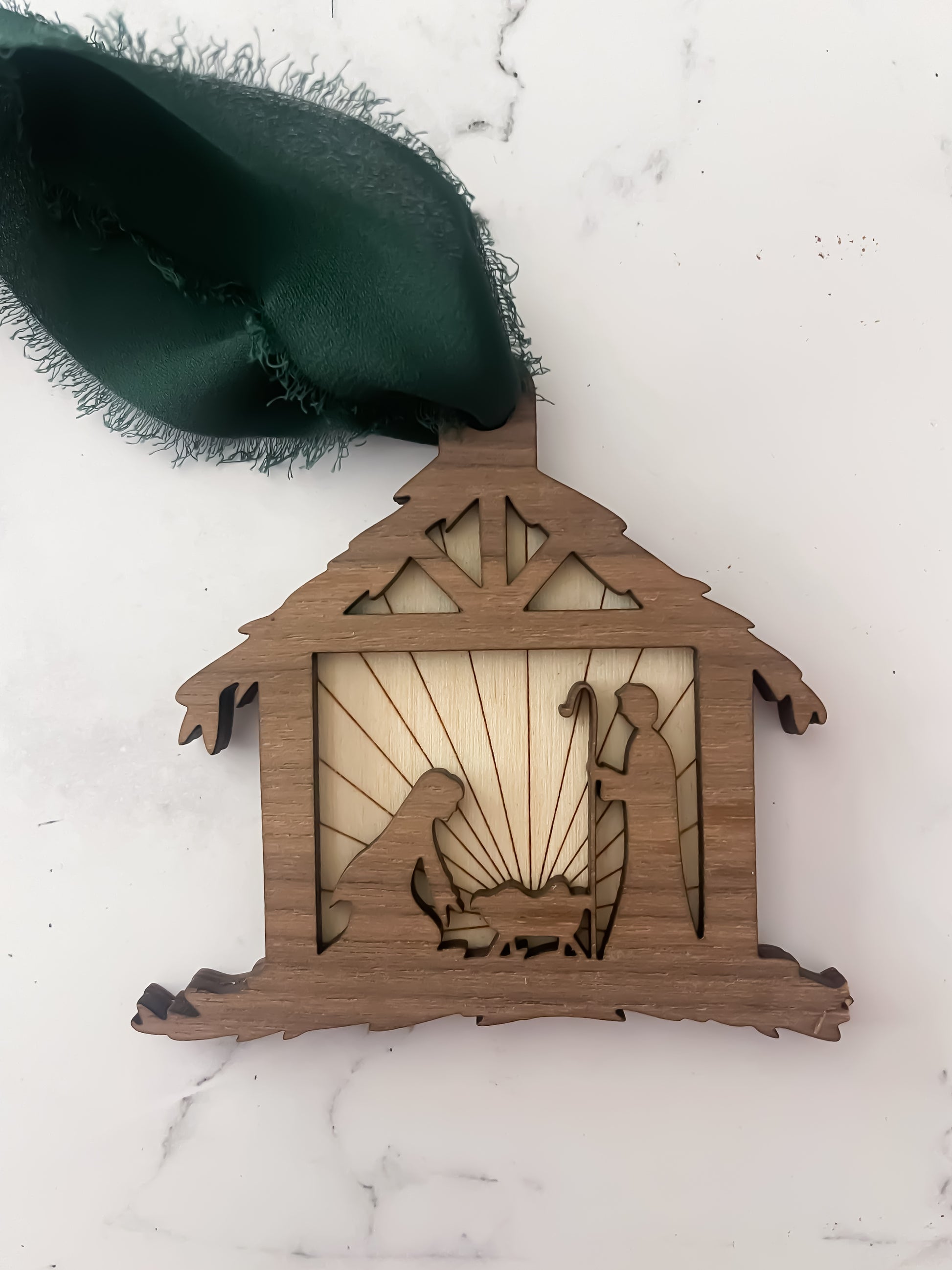 Introducing our hand crafted Wooden Nativity Ornament, a timeless piece that beautifully captures the essence of the Christmas story. This unique ornament features a top layer made from rich Walnut wood, and the back layer crafted from Baltic Birch wood, creating a natural & rustic charm.