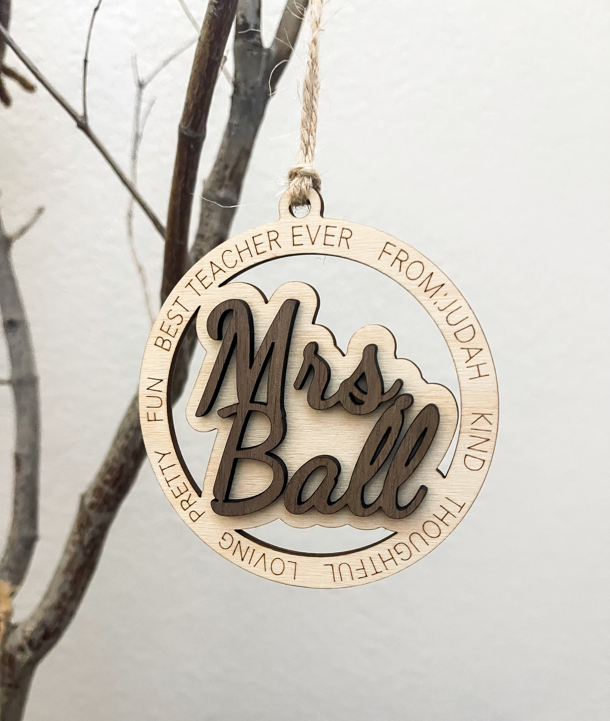 The true magic of this ornament lies in the personalization surrounding the teacher's name. Ask your child to share a list of words that capture why they love their teacher. These words are then delicately engraved on the wooden circle, creating a heartwarming momento.